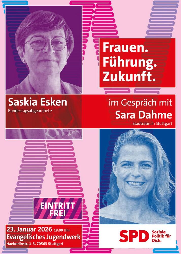 Wir freuen uns, Euch am 23. Januar 2026 um 18 Uhr im Evang. Jugendwerk zum Thema "Frauen. Führung. Zukunft" mit Saskia Esken (MdB) im Gespräch mit Sara Dahme begrüßen zu dürfen.