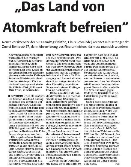 Neuer Vorsitzender der SPD-Landtagsfraktion, Claus Schmiedel, rechnet mit Oettinger ab: Zuerst Rente ab 67, dann Abservierung des Finanzministers, da muss man sich wundern.
